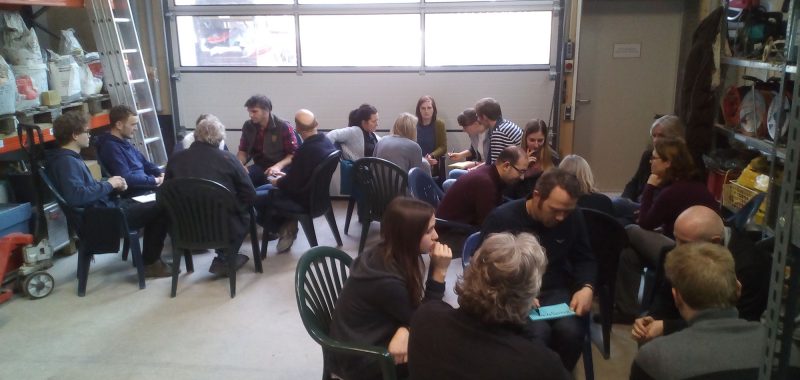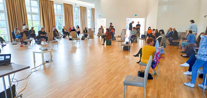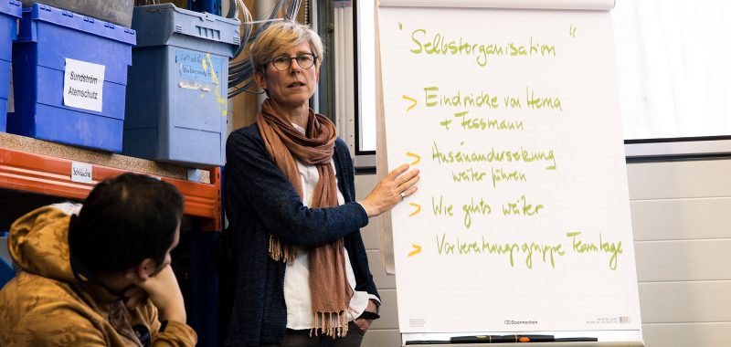 Was passiert, wenn wir von Menschen Veränderungen abverlangen? Wie viel geht auf einmal? Was braucht es auf der Beziehungsebene, um mit zu gehen? Wo taucht Zynismus auf? Wo Grenzen? Wie gehen wir damit um? Wie viele Veränderungen ist jede*r bereit an sich vorzunehmen? Da wurden Schuhe ausgezogen, Schals von sich geworfen oder umgelegt, Brillen hochgesteckt