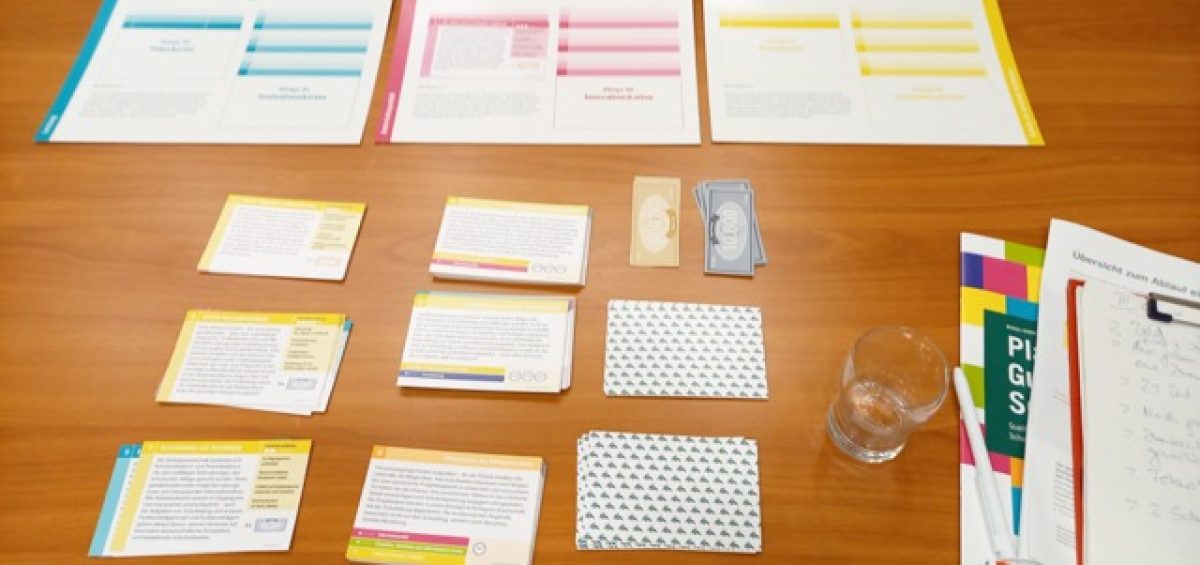 Die Qualitätskriterien für „gute Schule“ – einem Planspiel der Robert Bosch Stiftung – sind Verantwortung, Umgang mit Vielfalt, Leistung, Schulklima, Unterrichtsqualität und Schule als lernende Institution. Auf Fokuskarten gibt es dazu jede Menge Anregungen diese praktisch in die Schule zu integrieren. Geld und Zeiteinheiten sind wie im wahren Leben begrenzt und müssen Weise eingesetzt werden. Mit Ereigniskarten wie bei Monopoly funkt den Plänen Unvorhergesehenes dazwischen, das bewältigt werden will.