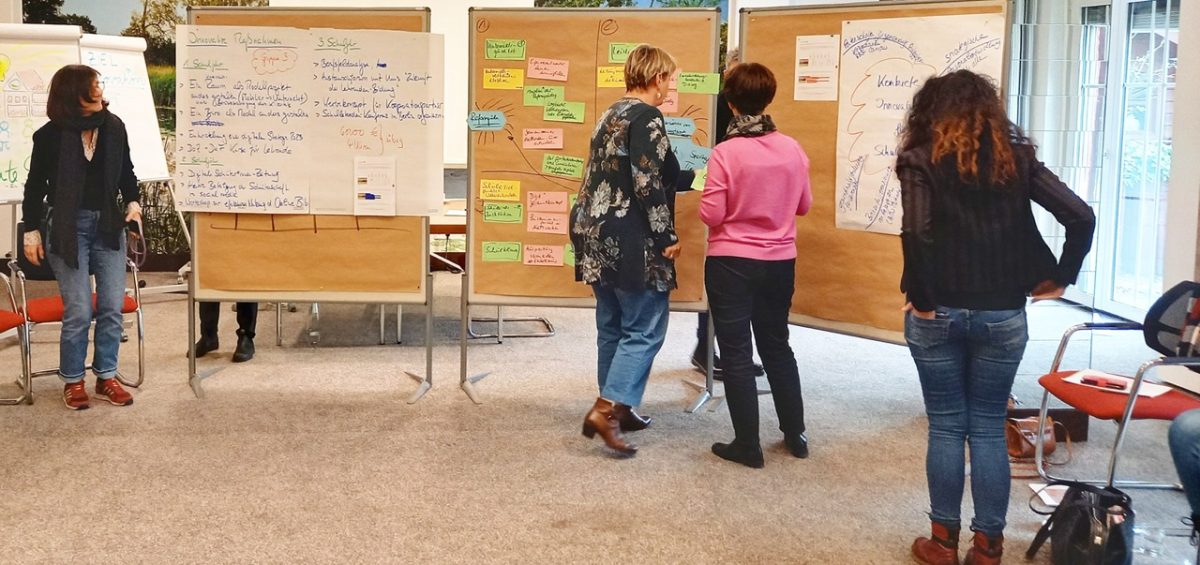 Die vier Gruppen mit je 5 Schulleitungen reichern auf spielerische Weise ihr Verständnis der Qualitätskriterien an. In der Auseinandersetzung mit ihren Kollegen*innen wird um die Zielsetzungen für die Halbjahre gerungen: Was bringt sie der gemeinsam gewählten Intention näher? Gleichzeitig wird Ihnen bewusst, was Sie alles an Ihrer Schule wie selbstverständlich bereits umsetzen.