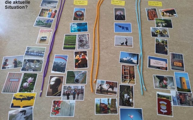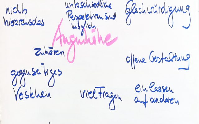 Für die praktische Führung durch die Positionen werden die Worte auf A4-Zettel geschrieben und auf dem Boden verteilt. Die Falleinbringerin stellt sich jeweils auf einen der Bodenanker, während sie eine Perspektive einnimmt. Hier ein Beispiel aus einem der Breakout-Rooms, in dem zu zweit gearbeitet wurde: