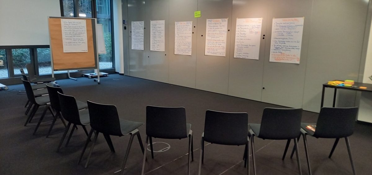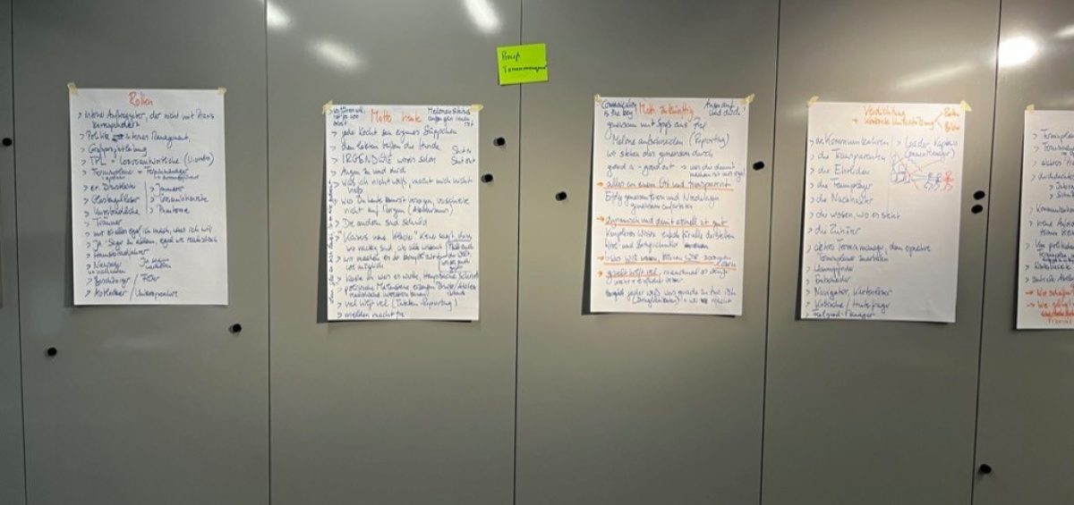 45 ausgewählte Projektmitarbeitende sollten an einer Diagnose der Themen-/Problemstellungen der Abteilung arbeiten. Dazu wurden unter anderem drei aktuelle Prozesse ausgewählt. Die Runde teilte sich nach Interesse auf. Die Kleingruppen von ca. 15 Menschen analysierten mit derselben Methode.