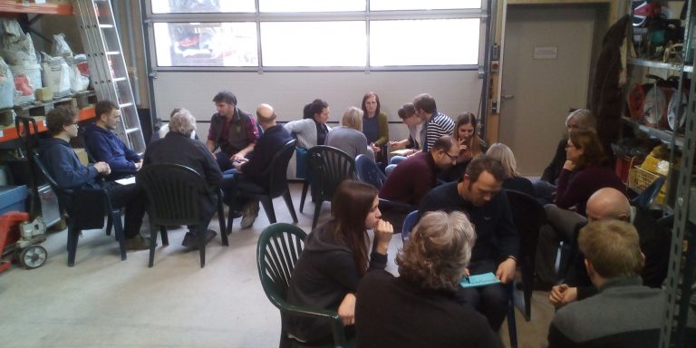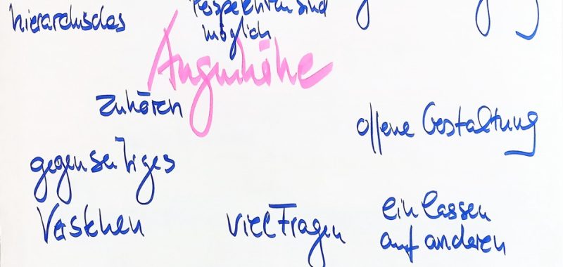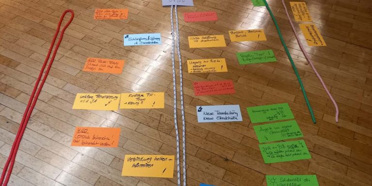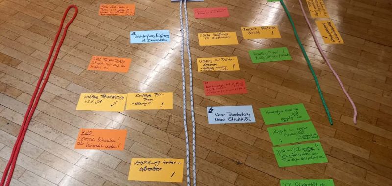 Was passiert, wenn wir von Menschen Veränderungen abverlangen? Wie viel geht auf einmal? Was braucht es auf der Beziehungsebene, um mit zu gehen? Wo taucht Zynismus auf? Wo Grenzen? Wie gehen wir damit um? Wie viele Veränderungen ist jede*r bereit an sich vorzunehmen? Da wurden Schuhe ausgezogen, Schals von sich geworfen oder umgelegt, Brillen hochgesteckt