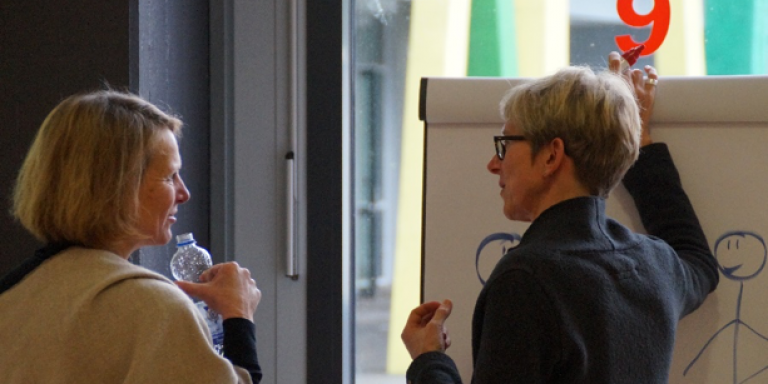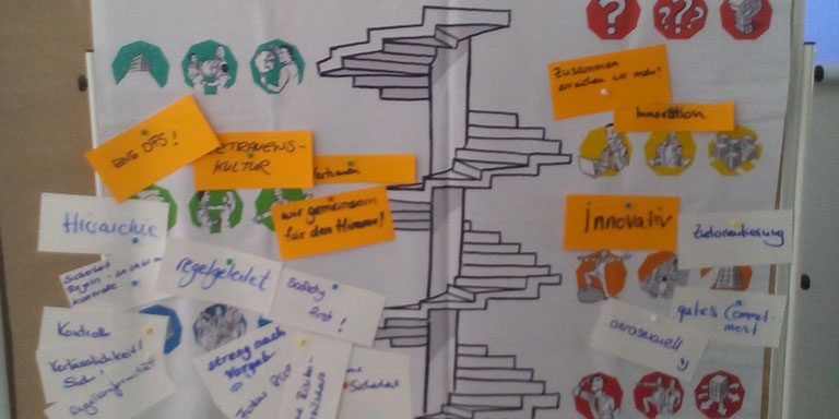 Die Konzepte des Zielvereinbarungs- und Mitarbeitenden-Gesprächs wurden nach über 15 Jahren komplett überarbeitet. In sieben eintägigen Workshops sind fast 100 Führungskräfte aus drei Ebenen zur gemeinsamen Reflexion und zum Austausch eingeladen. Der Kommunikationsmuskel wird sensibilisiert und trainiert: Was heißt Augenhöhe für uns? Welches Modell kann diesem Wort einen Bezugspunkt geben? Was ist unsere gängige Gesprächs-Kultur?