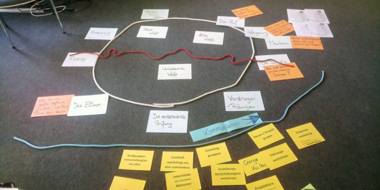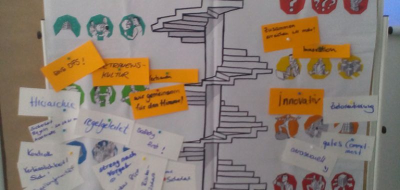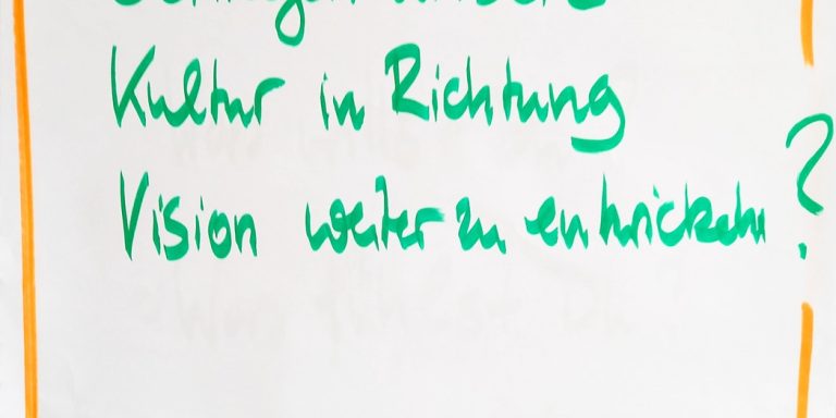 Wie beteiligt man fast 500 Mitarbeitende? Was ist unsere Vision? Wie können verschiedene Entwicklungsstränge in einer dezentralen Organisation wieder neu in einem Zopf zusammengeflochten werden? Was ist eine gesunde Größe für die Organisation? Dies ist ein Teil der weitreichenden Fragen, die in diesem Prozess wir als Moderation begleiten. Die Auftaktveranstaltung mit den Führungskräften hat viele