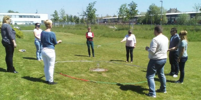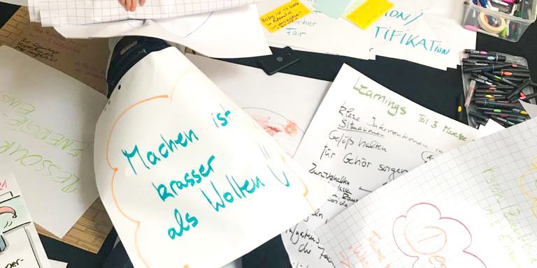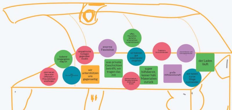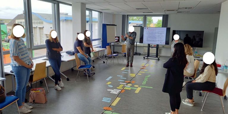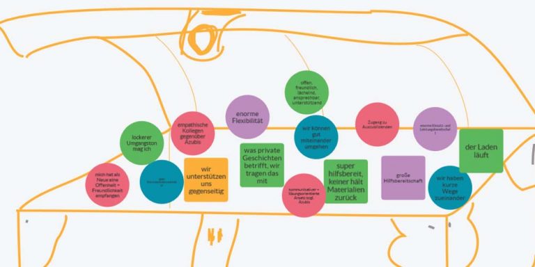 Das Modul 5 hatten wir digital durchgeführt. Zusätzlich gab es einen regelmäßigen inhaltlichen Kontakt mit der Gruppe in Videokonferenzen. Dann nach 3 Monaten der erste Termin mit den echten Menschen. Welche Freude, welche Freiheit und mit Abstand viele Möglichkeiten! Prototyping heißt: Dies ist für viele ein enormer Paradigmenwechsel, der seinen Schwung im Öffnen und sich