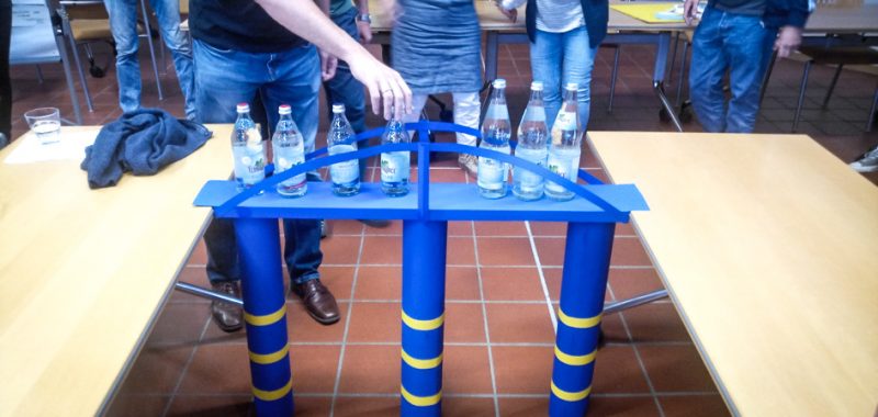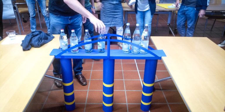 Über 30 Menschen aus Restauration, Architektur, Bauzeichnung und Verwaltung. Darunter Firmengründer und Berufseinsteiger*innen – von Ende 20 bis Anfang 60. Auf den diesjährigen Teamtagen – den fünften in unserer Zusammenarbeit – sind alle dabei: Mitarbeitende, Projektleitungen, Aktionäre, Vorstände und Aufsichtsräte. Zwei Themen kristallisierten sich, auch durch die Teamübung „Brückenbau“, heraus: Rollen und Aufgabenklärung mit Fragen