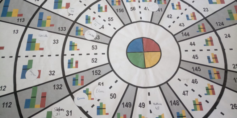 Zwei Tage intensives, persönliches und gemeinsamen Lernen: wie bündelt man diese Eindrücke lustvoll, wenn alle am Rande ihrer geistigen Kapazitäten sind? Im vier Bilderprozess werden nicht nur individuelle Erkenntnisse analog dargestellt, sondern auch das kollektive Wissen angetriggert. Ein Flippapier wird in vier Felder geteilt. Jede*r am Tisch bemalt für sich in Stille ein Feld mit