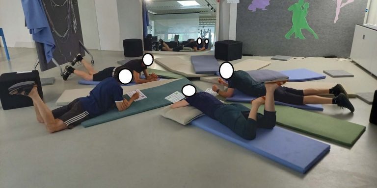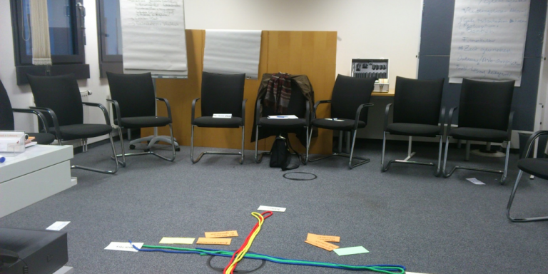 Einen Tetraeder bauen, das war der Ausgangspunkt in der digitalen Ausbildungsgruppe. Jeder Punkt des Tetraeders steht für eine Perspektive: Ich – Du – Kontext – Meta Für die praktische Führung durch die Positionen werden die Worte auf A4-Zettel geschrieben und auf dem Boden verteilt. Die Falleinbringerin stellt sich jeweils auf einen der Bodenanker, während sie