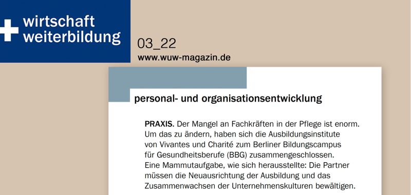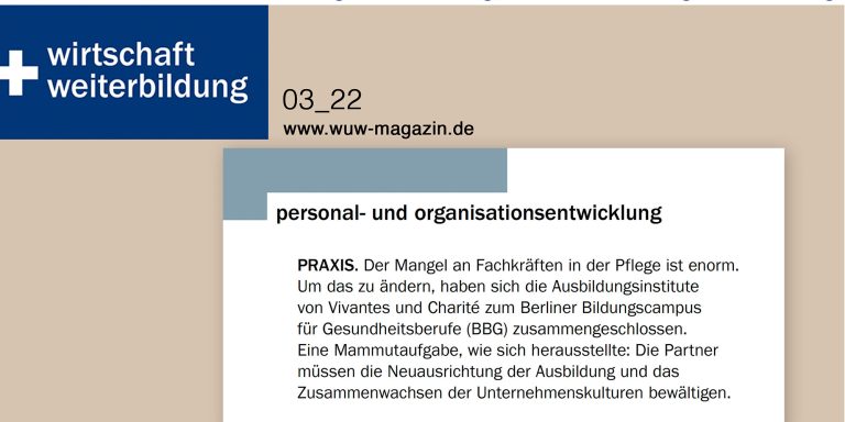 Artikel aus dem Magazin wirtschaft + weiterbildung (03/22): Anfang 2020 öffnete die BBG Berliner Bildungscampus für Gesundheitsberufe gGmbH ihre Tore. Das zum Klinikkonzern Vivantes gehörende Institut für berufliche Bildung im Gesundheitswesen und die Gesundheitsakademie der Berliner Charité wurden dafür zu einer Bildungseinrichtung zusammengeführt. Mit 3.000 Ausbildungsplätzen an insgesamt 13 Schulen ist der Campus die nach
