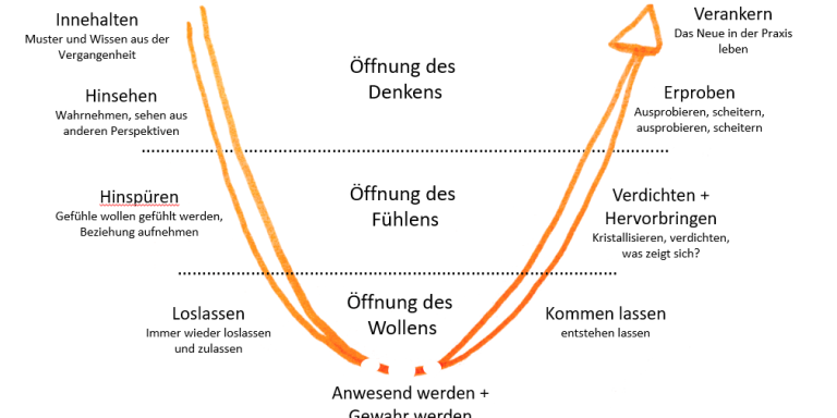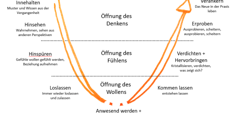 Das Anliegen war an der gemeinsamen Energie zu arbeiten. Keine neuen Joblisten – bloß nicht. Das Committment war da, der Auftrag auch. Doch was das genau hieß, war ein kleines Abenteuer. Veränderungen auf vierten Ebene nach Otto Scharmers Theorie U zu begleiten, heißt sich einlassen auf die Aufmerksamkeit aus dem im Entstehen begriffenen Feld und